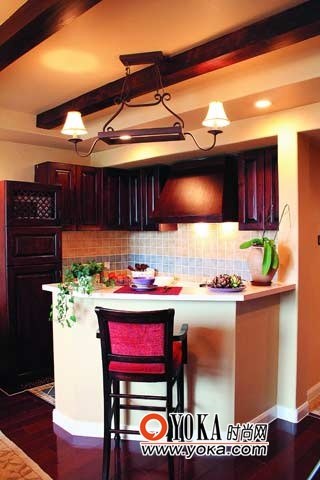 借用客廳一隅營建一個開放式廚房,一方面可以最大限度地利用空間,另一方面也利于督促自己改變烹調(diào)方式,減少油煙,更利健康。另一側(cè)則設(shè)計(jì)了一個多邊形的吧臺,作為客廳和廚房間的隔斷,平時也可以和家人一起在這里用一些簡餐或喝上一杯好酒。