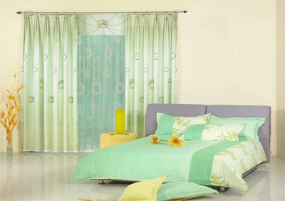 臥室中既然以床為中心了,其它飾物一般就應有“退居二線”的襯托意識。如窗簾,面積較大,太艷、太豪華了,就會與床飾形成兩個“中心”,以至讓人眼花繚亂。故窗簾應選用相應一點兒的色彩、圖案、面料,像一個“仆人”站在床邊。