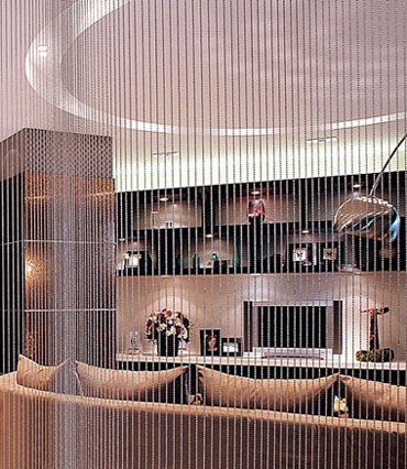 餐廳與客廳用圓形的天花燈槽增強(qiáng)了空間的獨(dú)立感,弧形的座燈與圓點(diǎn)圖案的地毯令整個(gè)空間氣氛沉靜卻不失活潑。臨空而懸的水晶珠簾是客廳的生輝妙筆,把飯廳與客廳區(qū)分開來,然而有隱約可見對(duì)方,給居室布置了一種隔而不斷的布局。