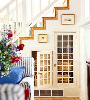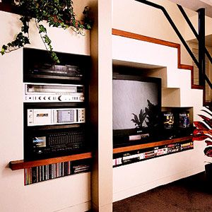 要想讓你的視聽區(qū)域看上去很大,那就要把電視機(jī)塞到樓梯下面的空間去。這樣的話,就可以不占用居室內(nèi)的空間,為你騰出更多坐立區(qū)域。記得在樓梯下所設(shè)計(jì)的收納柜,除了電視機(jī),還要能塞進(jìn)立體音響、DVD播放器、CD播放器等。