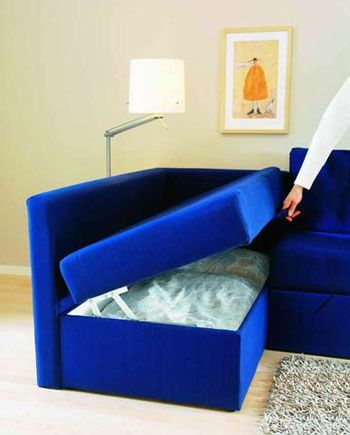 沙發(fā)不僅可以變成床,也可以“變身”成儲(chǔ)藏箱,幫助主人存放平時(shí)不用的被單、衣物。只需要提一下手拉帶,沙發(fā)的內(nèi)部空間就可以展露眼前。