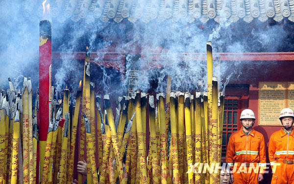 3月29日,在河南省新鄭市黃帝故里景區(qū)正殿前,一位工作人員在用液化氣為香客點香。當日是農(nóng)歷三月初三,相傳是中華民族人文始祖黃帝出生的日子,人們紛紛到黃帝故里進香祈福。