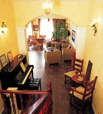 鋼琴旁的歐式花柱選擇簡(jiǎn)單的歐式紋理搭配中國(guó)式的青花瓷器,再現(xiàn)了老上海時(shí)候中西合璧的設(shè)計(jì)品位。