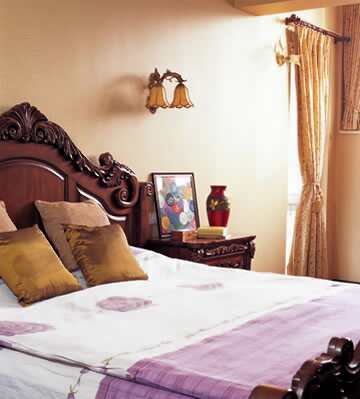臥房同樣延續(xù)著歐式風(fēng)格,采用大雕花實(shí)木床體,拋開(kāi)歐式中華麗的水晶與各種雕花的擺件,臥房也就沒(méi)有了眼花繚亂的奢華,反倒讓人有種安寧的舒適。價(jià)值不菲的波斯地毯安然地放在臥房地面上,沒(méi)有刻意顯露出它的華麗,只靜靜地在空間中調(diào)和著氛圍。