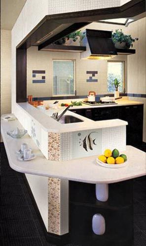吧臺(tái)的馬賽克與橘色的墻面配合燈光產(chǎn)生了不同的材質(zhì)肌理效果,高與低、靜與動(dòng)巧妙融合,集多種對(duì)比效果于一身,充分詮釋著馬賽克獨(dú)具的藝術(shù)性。