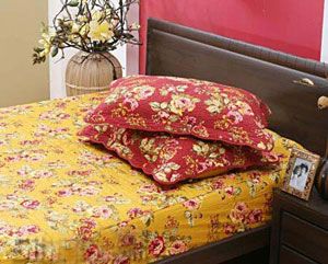 黃色為底床罩+紅色花朵靠枕 一幅田園氣息在臥室洋溢。以一種恬淡陶然的田園情懷再現(xiàn)精致浪漫的都市品質(zhì)生活:聞著空氣中彌漫著愛的氣息,那一份溫馨,那一份感動,盡在這一瞬間。空間,因為得到釋放而精彩紛呈。