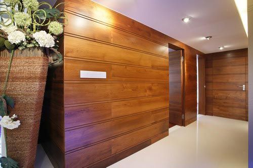 廊道一側:木質(zhì)墻板的大面積使用凸顯空間華貴,配和藤制的藝術花瓶讓空間莊重又不失優(yōu)雅。