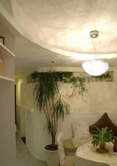 整個(gè)房間做了造型吊頂,唯獨(dú)餐桌上部頂面鏤;弧線的造型吊頂形成了白色曲線紋樣靠背的餐桌椅,搭配上了深草綠色的椅墊,與沿墻定做的弧形沙發(fā)和諧組合;碎花的餐桌布和沙發(fā)小靠枕點(diǎn)綴著不寬敞的餐廳空間。餐廳中彌漫著田園的清新氣息,給人帶來(lái)輕松舒適的氛圍,仿佛一踏入這里就可以聞到淡淡草味和濃郁的花香。