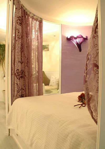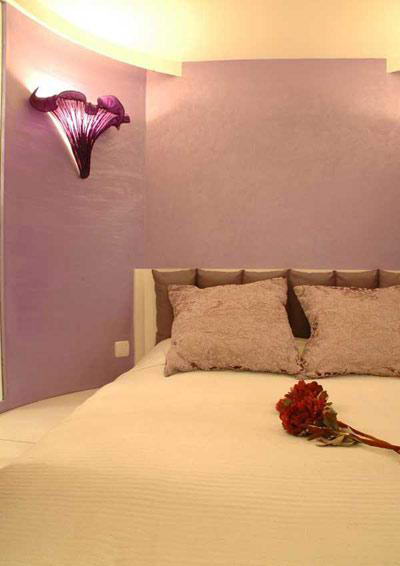 墻面采用了一種瑞典的“紫色天鵝絨”的特殊漆,有著絲絨般的特殊感受;女主人精心挑選了花卉藝術(shù)壁燈與之相搭配。在白色空間中,營(yíng)造出紫色浪漫的睡眠空間。