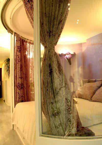 在整室比較置中的位置,設(shè)計(jì)師營(yíng)造了很特別的臥室空間。在趨于正圓的平面規(guī)劃布置中,圓形的木質(zhì)地臺(tái)上鋪上標(biāo)準(zhǔn)的床墊,便是一張圓形大床;床墊邊上剩余地臺(tái)空間取代了床頭柜的功能,地臺(tái)臺(tái)面可以開(kāi)啟,儼然是很大的儲(chǔ)藏空間。