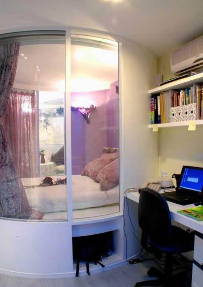 從陽(yáng)臺(tái)望去,圓柱的玻璃造型睡眠區(qū)依舊是居室的出彩點(diǎn);倚墻安置的一塊臺(tái)面和二塊擱板簡(jiǎn)約而流暢的造就了家中的辦公空間。