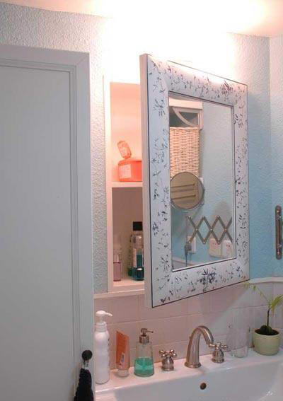 將這面掛鏡改造成了鏡面柜門,打開(kāi)柜門里面是新建的柜體,擱板居中放置提供了隱秘的置物空間。