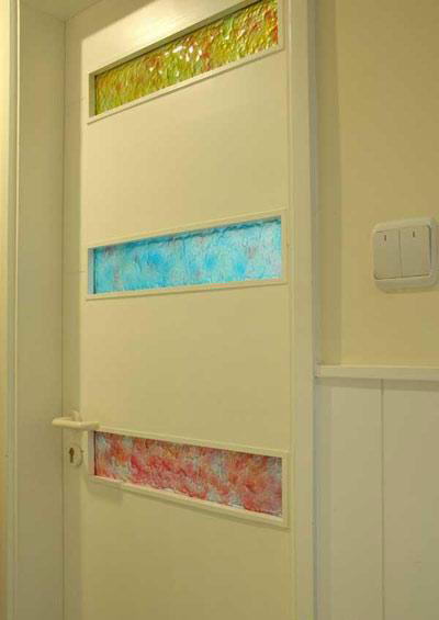 衛(wèi)生間的門是根據(jù)設(shè)計(jì)定制加工的,選定了門樣式另外搭配了3塊琉璃玻璃鑲嵌,紅、黃、藍(lán)三種色調(diào)賦予了白色門板藝術(shù)的多彩絢爛氣息。