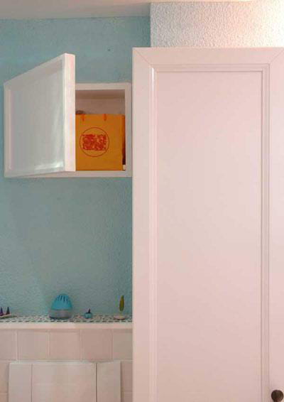 馬桶上方暗藏了一個(gè)柜體,柜門上打算安裝鐵藝畫(huà)裝飾,但一直尋覓不到中意的,索性先留白。這樣看起來(lái)像是一個(gè)畫(huà)框,也給人留下些許想象的空間。