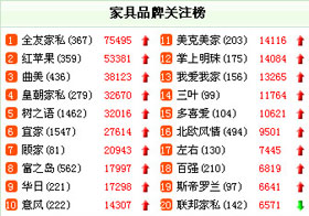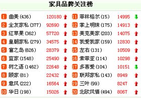 圖二是截至4月8日的家具品牌關注榜及關注度top10分布圖,跟圖一相比我們不難看出,品牌關注榜的普遍關注度均走上升趨勢,排行第一由原來7萬增長到了十二萬,北方家具曲美超越了四川的全友榮登第一寶座,而緊跟其后的依然是全友、紅蘋果、皇朝等知名品牌家具企業(yè)。值得一提的是富之島家具由上月的排名第八竄升到本月前五名,關注度也大幅上漲。