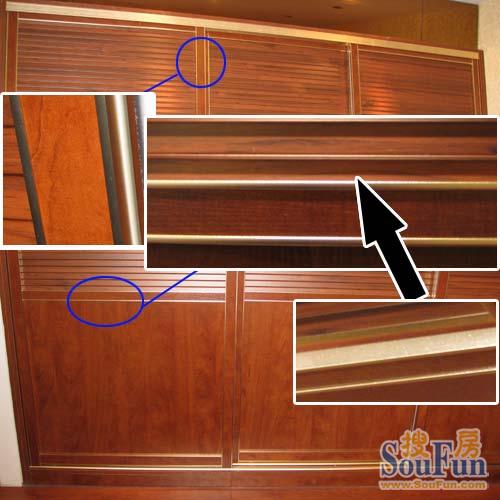 這款衣柜最特別的地方就是金色的金屬飾邊,設(shè)計(jì)簡(jiǎn)潔而有表現(xiàn)力,這些金色的金屬邊既起受力作用,又起到極強(qiáng)的裝飾效果,燈光一照,整個(gè)空間金黃燦爛,非常美麗;封邊條也與板材一樣的木紋紋理,并且一樣是浮雕效果,整體敢非常強(qiáng),而過度處的顏色略淡,而金邊呼應(yīng),竟有金線的裝飾效果,好似整個(gè)衣柜鑲了金似的。