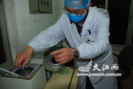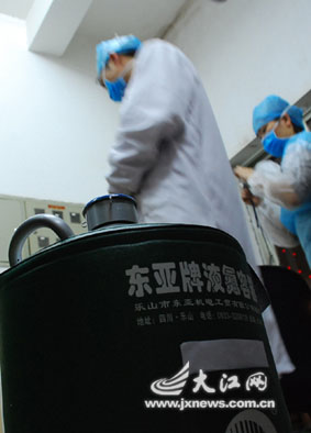 這邊在注射麻藥,那邊醫(yī)生在另外一間屋內(nèi)進(jìn)行取精。負(fù)責(zé)取精的醫(yī)生唐海勛告訴記者,**開(kāi)始是冷藏于-196℃的液氮罐里;之后,取出放入水溫36℃的水浴箱,進(jìn)行平衡溫度并且保濕;再在分離器里將活**與死**分離,將活**聚集收集;再對(duì)其進(jìn)行洗滌、激活。至此,完成取精過(guò)程。