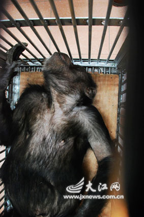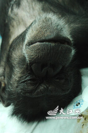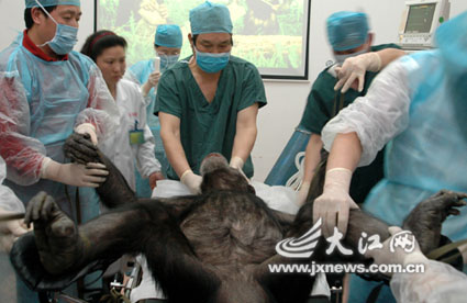 在被抬進(jìn)手術(shù)室前,南昌動(dòng)物園的黑猩猩“壯壯”躁動(dòng)不安,不停嚎叫。