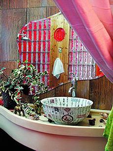 中式就一定是板起臉來的陰沉樣子嗎?當然不是,只要稍加改觀,就可以打破僵局。頁巖和小石子共同組成的沐浴區(qū),如果沒有這個特殊的浴盆會多么平淡!但是看到這個青花大瓷缸被用作浴盆,人在一片水氣氤氳中坐進去,總會讓人會心一笑。還有那只端端莊莊的洗手盆,旁邊是各種各樣、大小不同的海螺,可見主人的童心,當然這樣搭配也很好看。