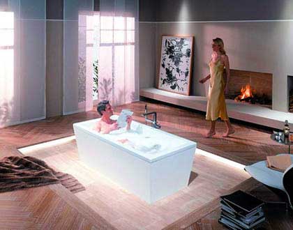 再有,衛(wèi)浴不能設在家宅的中心?,F(xiàn)在有些時尚人士喜歡把浴盆設置在客廳的正中間,彰顯浪漫的特色,但在風水學來看,這樣極為不妥。