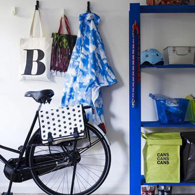 這是一個色彩繽紛的門廳,時尚簡潔的儲物架使這里的色彩一下子明亮起來,而且讓這里有更多的存儲空間。放置些小儲物盒可以分類收納物件,墻上的掛鉤能夠掛些包包和外套,都是十分實用的。
