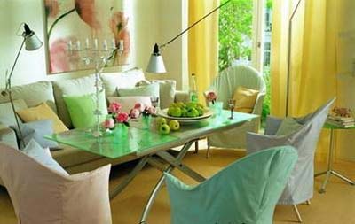 在整體空間面積不大的房子中,可以不專門開辟就餐區(qū),將玻璃餐桌往“玻璃墻”邊一靠,通過鏡子的效果,讓整個空間得到了充分的利用和延展,同時有效地讓視覺空間得以放大。