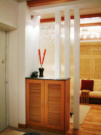 此外,還可以在門廳與客廳或衛(wèi)生間分界處,設(shè)計(jì)上一套屏風(fēng)或玻璃隔斷,,既保證了門廳的完整性,又減弱了空間的封閉感。