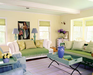 這也是用了一組亮度相同的相鄰色以條紋組合的形式出現(xiàn)在客廳的一面墻上,而這面墻相鄰的兩面墻分別刷成彩色條紋里的粉紅色和粉藍(lán)色。沙發(fā)和兩個(gè)坐凳的外套配備了和彩色條紋里相同的幾種顏色以隨時(shí)更換。