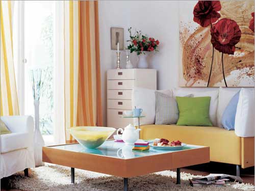 東向客廳宜選用黃色作為主色調(diào),顏色深淺的選擇,則由屋主根據(jù)自己的喜好來定,黃色于東方,有招財?shù)男Ч?/P>