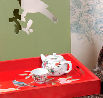 紅色的長方形托盤底部,裝飾著工筆花鳥圖案,細膩精致,與飾有花鳥圖案的瓷質茶具十分相配,營造出鳥語花香的氣氛。豆綠色的高背椅更為別致,椅背上面的圖形做了鏤空處理,透出一只站在花枝上小鳥的剪影,新穎獨特。