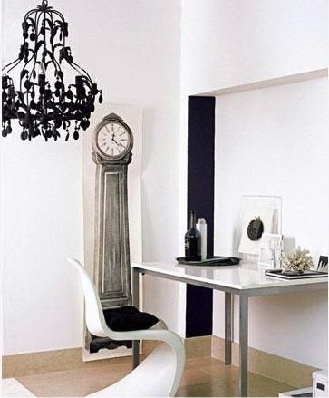 一條簡單的黑色長條色塊增加了角落的深 度,本來容易被忽視的角落反而成為了居室里的亮點。其它配飾的選擇除了顏色非黑即白之外,最 好選擇不同的材質和質地,這樣就會有既豐富又單純的效果。