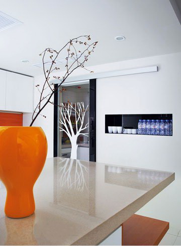 一間小的廚房間,由推拉門隔離。玻璃門 上的白色樹枝圖案,與屋內(nèi)的白色統(tǒng)一一致。