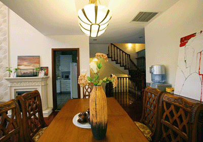 由于客廳面積不是很大,又要做出大氣磅礴的氣勢,于是設(shè)計師采用洗練的設(shè)計手法,力圖達(dá)到 '增一分嫌多,減一分嫌少 '的完美境界,主題墻上的砂巖藝術(shù)造型'氣貫長虹'一通到頂,無意中一種大氣磅礴的氣勢立刻呈現(xiàn);超大尺寸裝飾畫也是量身定做,與對面主題墻'里應(yīng)外合';美式家具,壁爐,玉器,馬燈,這些設(shè)計元素相互交織,相互融合,達(dá)到"你中有我,我中有你"的美式家具,壁爐,玉器,馬燈,這些設(shè)計元素相互交織,相互融合,達(dá)到"你中有我,我中有設(shè)計目的