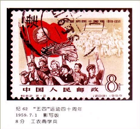 1959年7月1日,正值中華人民共和國成立十周年前夕,我國發(fā)行“紀(jì)62”《五四運(yùn)動四十周年》紀(jì)念郵票一套兩枚,面值分別為4分和8分。這套郵票由鐘涵設(shè)計,主圖分別為高舉馬列主義旗幟“向科學(xué)技術(shù)進(jìn)軍” 的人們和高舉***思想旗幟的“工、農(nóng)、商、學(xué)、兵”各界群眾,背景為天安門及“五四”運(yùn)動浮雕。