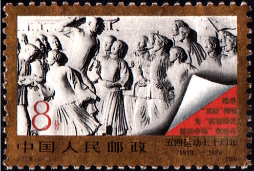 1989年5月4日,我國發(fā)行“紀(jì)58”《五四運(yùn)動七十周年》紀(jì)念郵票一套一枚,面值8分,由何潔、李躍義共同設(shè)計,圖案為卷起的“五四運(yùn)動”浮雕。