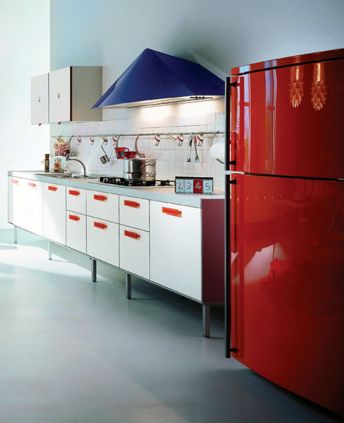 這無疑是一個(gè)調(diào)色高手的作品,采用經(jīng)典的白為底色,再配以同樣是經(jīng)典的藍(lán)和紅作為點(diǎn)綴,冷暖色調(diào)的沖突,卻帶出了極佳的視覺效果。原來,于傳統(tǒng)之中見時(shí)尚,不過就是給單調(diào)而普通的家電、櫥柜的把手、煙機(jī)的頂蓋,披上色彩的外衣而已。