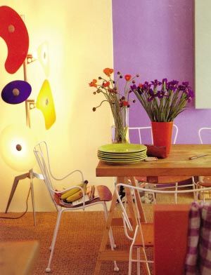 在淡紫與鵝黃色彩柔和的平面上,一個多彩的燈飾,幾乎是抽象派藝術的翻版,不規(guī)則的形狀以及三原色在此都可以看到。從花瓶與插花中,橘色與紫色的平衡,到椅子流暢的線條,每一細節(jié)無不精心設計,從而達到整體的完美。