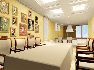 長(zhǎng)寬比例是餐廳的一大挑戰(zhàn),把衛(wèi)生間縮小30公分,占用部分廚房面積增加出一個(gè)保姆的空間。頂部?jī)擅孜甯叩牧旱资沟玫蹴敍]有太多可變的余地,三個(gè)窗占用了所有可以利用的廚房吊柜空間,通過滿墻的裝飾畫來(lái)烘托進(jìn)餐的氛圍。