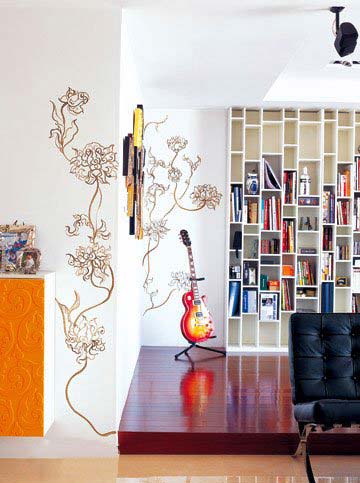 簡約風(fēng)格的家中,往往蘊(yùn)涵著一語道破的 驚喜,如同一個不顯山露水的人,卻可能擁有耐人尋味的人格魅力。二者另一個共同點(diǎn)在于,都需 要我們?nèi)グl(fā)現(xiàn)和探尋。進(jìn)門正對著的墻壁,是給來者第一眼的印象,起初不敢畫,因?yàn)檫@個位置太 重要,太顯眼。丙烯、金漆,出來后的效果令人滿意,于是它們繼續(xù)'攀爬' 到客廳的墻面上。
