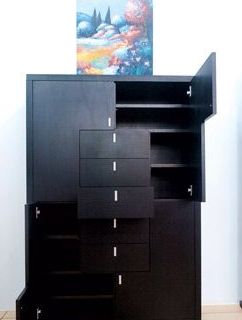 這款鞋柜高高大大,中規(guī)中矩,整體看上去像個憨厚笨重的大家伙,但你不可小瞧它的機關(guān)秘密。只要按動那些白色的小按鈕,柜門就會一個個彈出來,給你驚喜之外,還會讓你體驗“挫折”,因為并不是所有的白色按鈕都設(shè)有自動彈開的機關(guān),比如第二個和倒數(shù)第二個按鈕就完全是純裝飾用。所以你只有熟悉了它的小秘密,才能對它完全掌控。當(dāng)然鞋柜還是非常實用的。柜子中各個區(qū)域的面積大小不一,適合存放儲物,將中間抽屜彈開,那里才是放置鞋子的溫柔鄉(xiāng)。