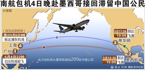 新華網(wǎng)廣州5月6日電(記者陳冀)記者從中國(guó)南方航空公司獲悉,北京時(shí)間6日凌晨2時(shí)52分,南航赴墨西哥包機(jī)從墨西哥蒂華納機(jī)場(chǎng)起飛,經(jīng)過約14小時(shí)的飛行,預(yù)計(jì)北京時(shí)間5月6日16時(shí)35分到達(dá)上海浦東國(guó)際機(jī)場(chǎng)。