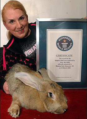 這只名叫艾米的巨型兔長(zhǎng)1.2米,體重20公斤,每天要吃掉兩個(gè)蘋果、半個(gè)卷心菜、一把胡蘿卜,以及大量新鮮青草和混合飼料,2008年它被吉尼斯世界紀(jì)錄評(píng)為全球體積最大的兔子。據(jù)艾米的主人、現(xiàn)年56歲的英國(guó)婦女安妮特·愛德華茲介紹,她前不久帶著艾米從英國(guó)飛往意大利參加一檔紀(jì)錄片節(jié)目的拍攝。但在拍攝完成當(dāng)晚,艾米就在旅館里告別了人世。