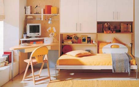 ■ 變化范圍廣:床鋪的尺寸為940厘米X200厘米,完全能夠滿足成人使用標(biāo)準(zhǔn)。而且書桌椅也是可伸縮調(diào)節(jié)高度的,所以可適合各個年齡段的兒童使用。由于家具使用的淺藍色與白色為中性色,沒有明晰的性格取向,所以也就很容易通過床單和其他小物件的搭配來營造適合不同年齡段、不同性別兒童的居室風(fēng)格。如綠色、橙色、黃色就比較適合男孩子的房間,而紫色,橙紅色就比較適合女孩子的房間。