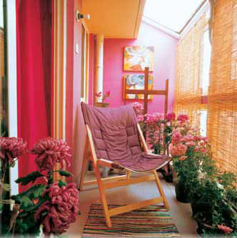在陽臺外側裝一鐵架,錯落有致地置上各種盆栽花木;在陽臺內(nèi)側和扶欄上擺放一些山水盆景;陽臺兩側可搭架種植幾株牽?;ā㈤L春滕、葡萄等攀滕植物;或在陽臺上鋪黑白的鵝卵石,種上中國蘇州園林中最常見的荷花、翠竹,一個理想中的世外桃源就這樣生成了?;蛘堅O計師在陽臺上創(chuàng)造了一個“微縮景觀”,并與客廳墻上的中國古典仕女畫相之呼應。濃濃的中國情節(jié)籠罩著整個居室,讓每一位來此的人們都感受到自然的生機和活力。令人不出家門就可盡情地享受到大自然的樂趣。
