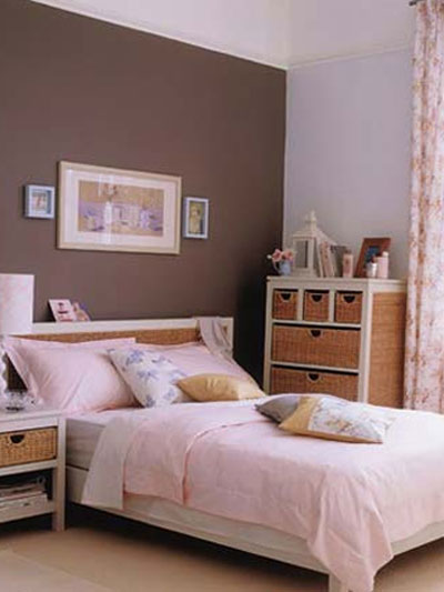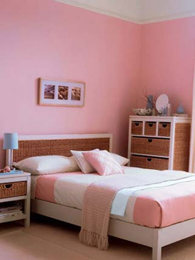 粉紅色的墻面定下整體基調(diào),給人以朦朧的浪漫感覺?;野咨蛎靥?,以及白色窗簾與粉紅色過度十分自然。白色的床邊小桌和柜子仍然帶藤制抽屜,桌上放有藍(lán)色托盤和藍(lán)色臺(tái)燈,是整體色調(diào)中活潑的一筆,柜子上飾以小圓鏡、藍(lán)色花瓶和小花枝?;野咨拇采细惨苑奂t色的床罩,白色床單、白色枕頭、藍(lán)、粉色小靠墊,溫暖而舒適。
