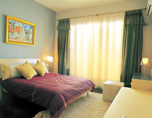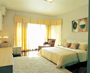 白色系墻面,淡橘色的窗簾,米色的床被、地毯,整個主臥形成一種明快的色彩,顯得和諧、淡雅。整體對比柔和,避免給人太強(qiáng)烈鮮明的感覺而不易入眠。床背景墻上的掛畫,不僅是主臥里視覺聚焦的中心,同時也富有現(xiàn)代氣息??Х壬膯稳松嘲l(fā),作為窗口的一個小小休閑區(qū)域,方便主人臨睡前和起床后偶爾小坐。