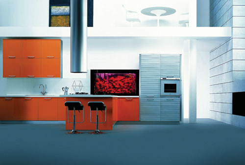 煙機(jī)不過是最常見的廚房道具,但在這里,復(fù)式的房子,為長型的煙機(jī)提供了展現(xiàn)自我的場地,不僅能把功能發(fā)揮到極致,更能成為最引人注目的裝飾品。如果你有足夠的創(chuàng)意,不妨還可以像這樣把大型魚缸搬到廚房來,讓他們營造出更前衛(wèi)的效果。