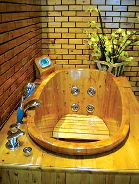 如果真的追求古人沐浴的感覺,這款圓木桶應(yīng)該是最好的選擇,跟在電視上看到的模樣幾乎一樣,只是感覺用材更優(yōu)良,不必?fù)?dān)心發(fā)霉,而且還加了個小梯子,更顯人性化。要不這么高的木桶,還真該考慮要怎么走進去。在木桶里灑上些花瓣,就和想象中的古人沐浴更加接近了;如果覺得那還不夠愜意,盡可以倒些牛奶、啤酒進去,古今結(jié)合,定能洗出一身好皮膚。