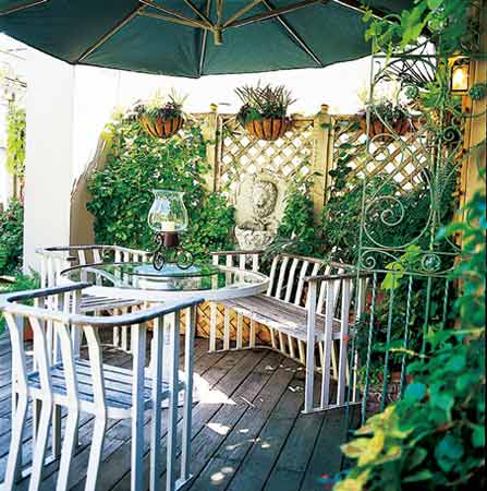 下沉式花園的上面,是一個(gè)實(shí)用的小露臺(tái)。質(zhì)樸的木地板和茂盛的植物,是打造休閑感覺(jué)小庭院或露臺(tái)的有力手段。