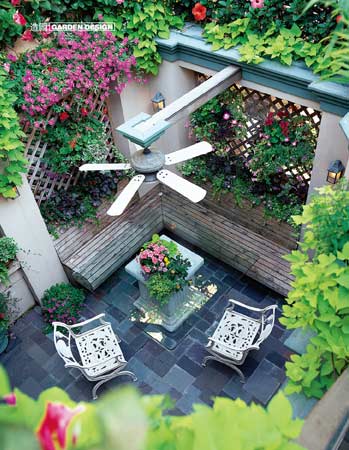 即使在沉悶的天氣里,下沉花園上方懸臂上的吊扇,也會(huì)給在花園里乘涼的人帶來(lái)習(xí)習(xí)清風(fēng)。到了寒冷的季節(jié),就是漂亮壁爐發(fā)揮作用的時(shí)候了,暖暖的火光能驅(qū)走寒冷,增加戶外空間的使用時(shí)間?;▓@中種滿熱帶氣息的植物,如棕櫚樹(shù)、芙蓉花、黑葉芋與一年生植物、蔓生植物填滿了花箱和花盆,給小庭院帶來(lái)生機(jī)勃勃的感覺(jué),也達(dá)到了阻隔外界視線、保護(hù)隱私的作用。而小噴泉潺潺的流水聲則把街道的喧囂淹沒(méi)在外。